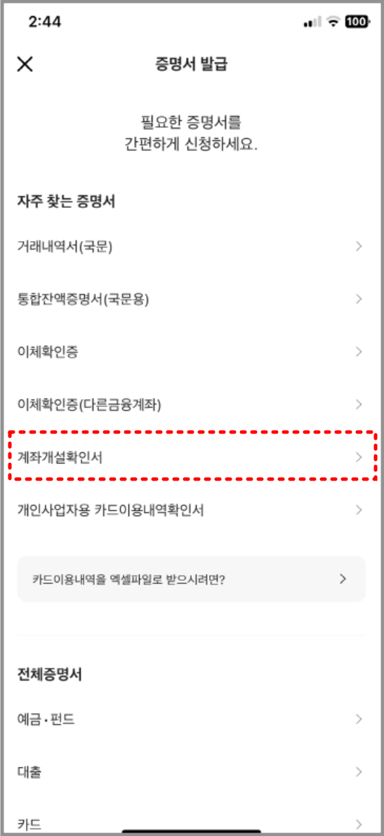 5. 증명서 발급 화면에서 '계좌개설확인서'를 선택합니다.
