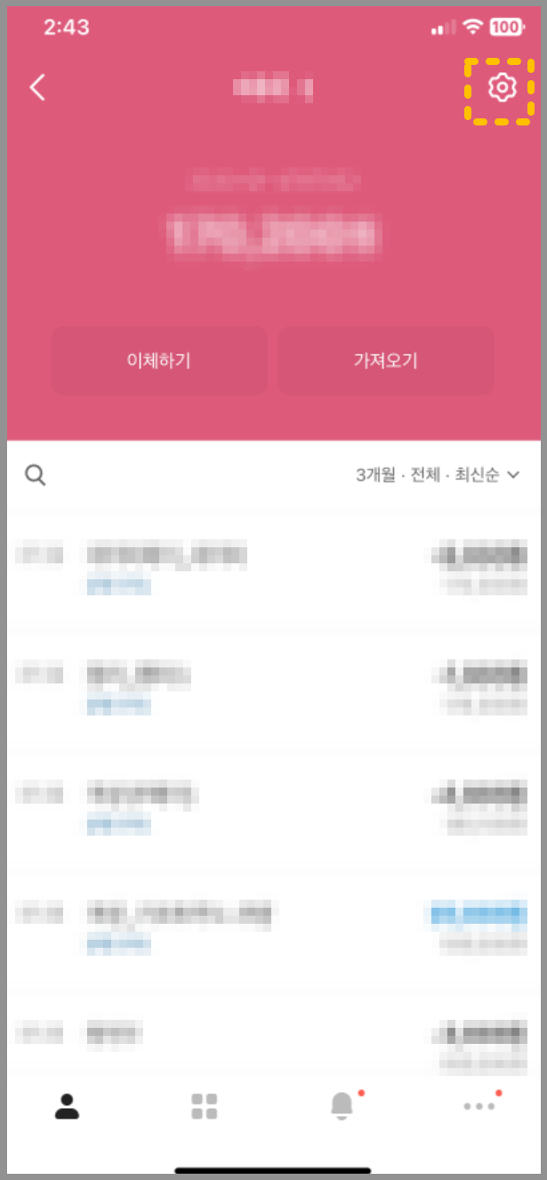 3. 계좌번호 우측 상단의 '설정(톱니바퀴 모양 아이콘)'을 선택합니다.