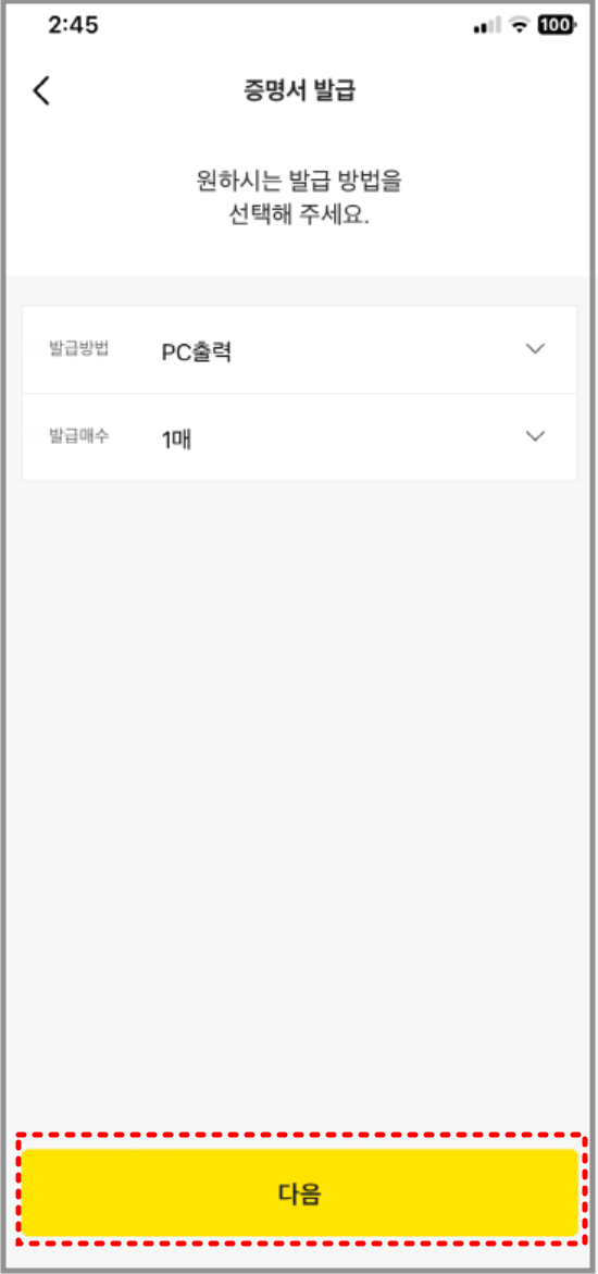 6. 증명서 발급방법과 매수를 선택하고, 증명서를 발급할 계좌를 선택합니다.