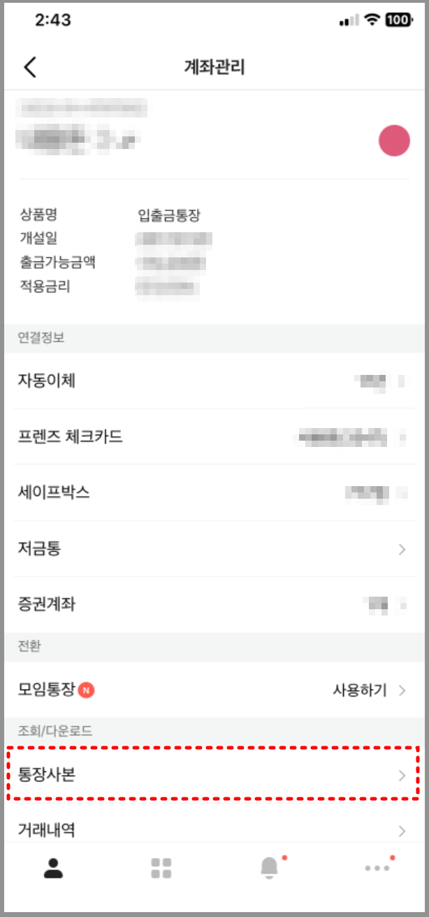4. 계좌관리 창에서 하단에 '통장사본'을 선택합니다.