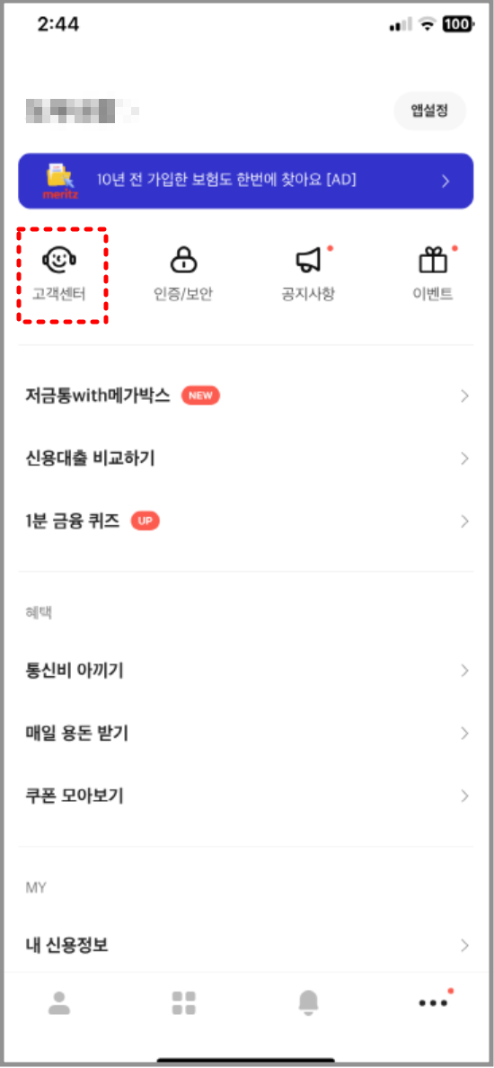 3. 메뉴 목록에서 '고객센터'를 선택합니다.