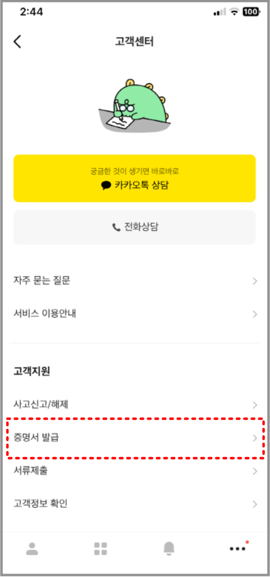 4. 고객센터 페이지에서 '증명서 발급'을 선택합니다.