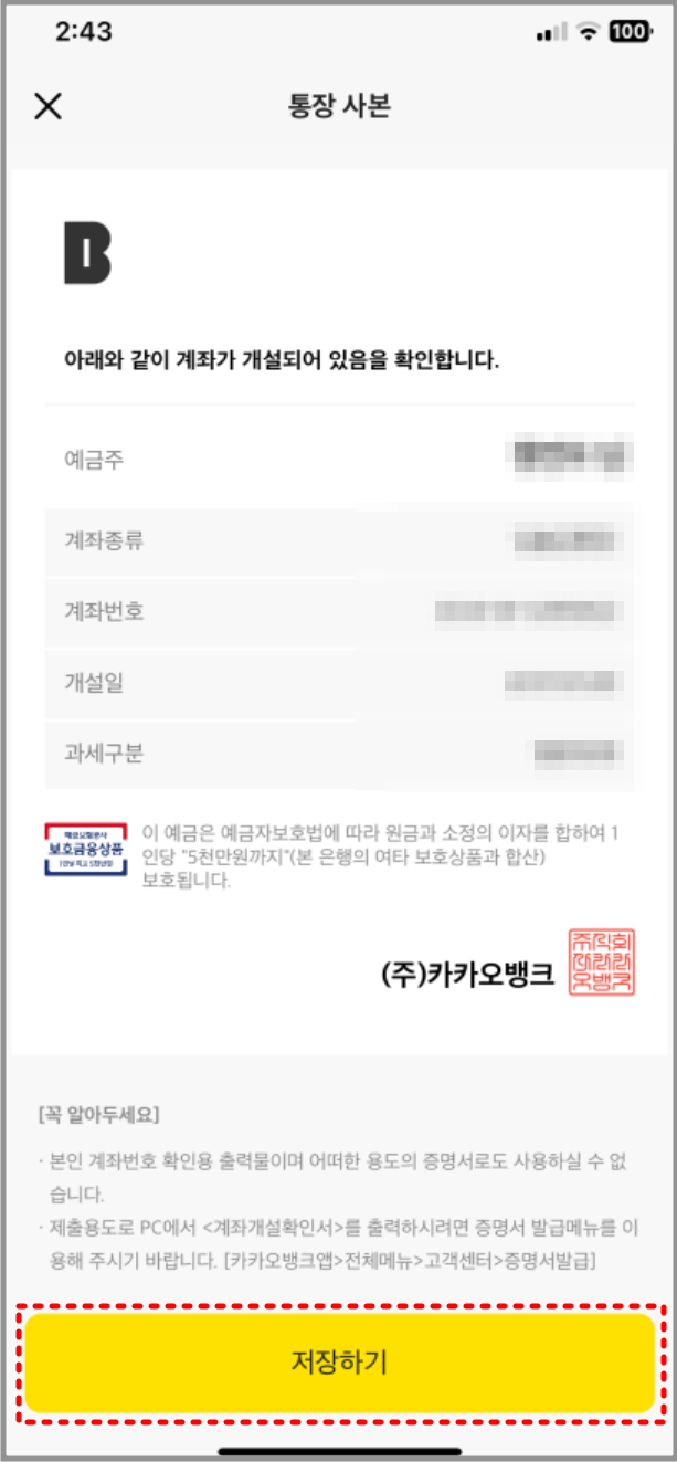 5. 통장사본이 화면에 보이면 '저장하기' 버튼을 눌러 이미지를 저장합니다.