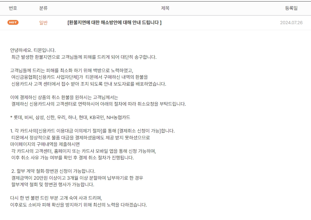 티몬은 지난 7월 26일, 공식 홈페이지를 통해 환불지연에 대한 해소방안을 공지했는데요. 내용은 다음과 같습니다.