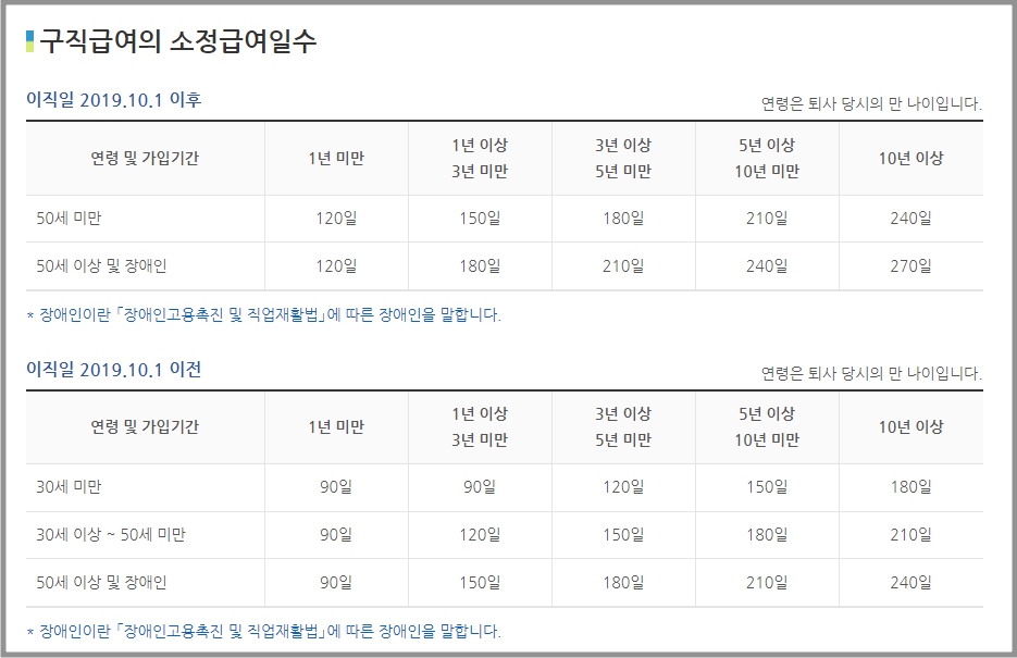 (이직일이 2019.10.1. 이전은 퇴직 전 평균임금의 50% X 소정급여일수)