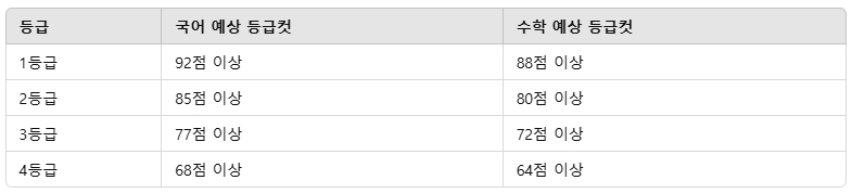 • 등급컷 : 각 등급의 최소 점수 기준으로, 1등급부터 9등급까지 나뉘어 있습니다.