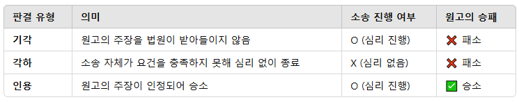 ❗ 소송 자체가 인정되지 않는 경우이므로, 기각과 다르게 심리 과정 없이 종료됩니다.