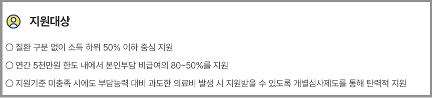 지원대상은 소득 기준을 충족하면서 고액의 치료비 지출이 발생한 가구입니다.