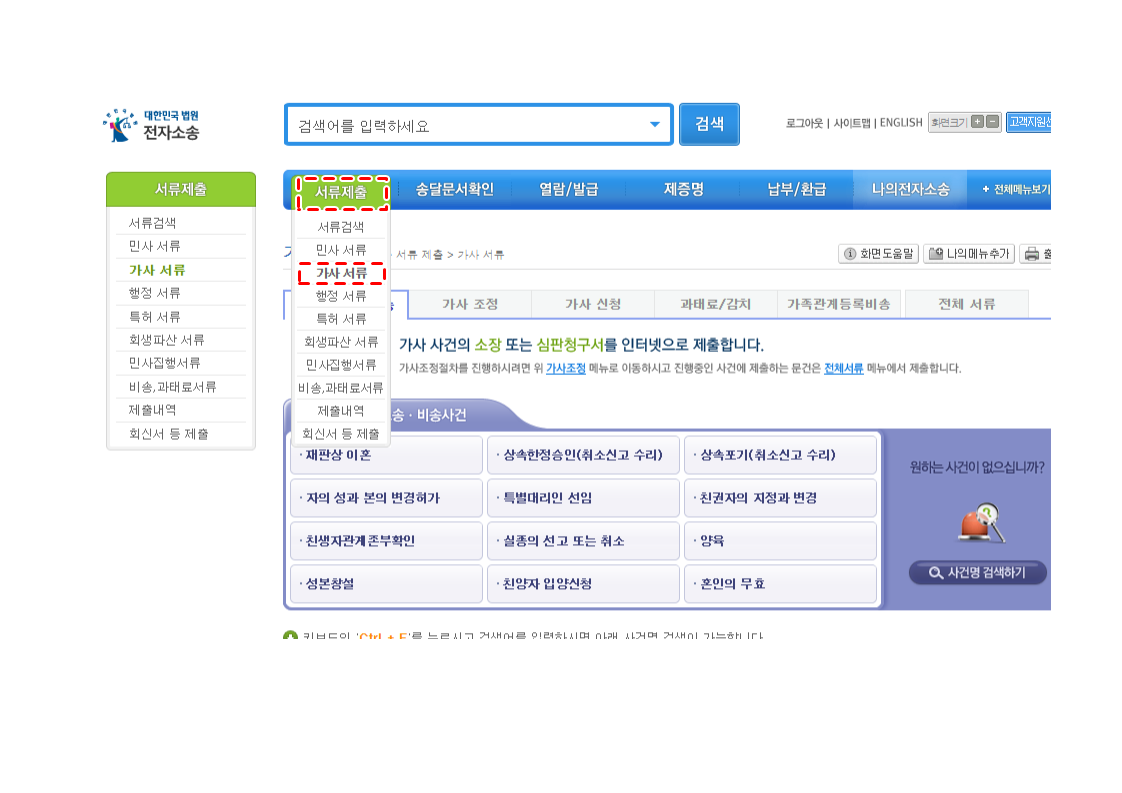 사이트에 접속 후, 서류제출 - 가사서류를 선택합니다.