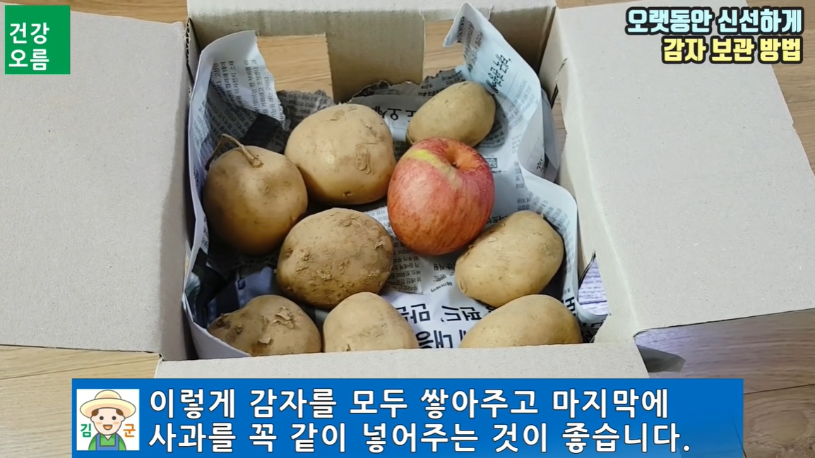 5. 감자를 모두 쌓아주고 마지막에 사과를 꼭 같이 넣어주는 것이 좋습니다. 그러면 사과에서 나오는 에틸렌 가스가 감자에서 싹이 나는 것을 막아줍니다.