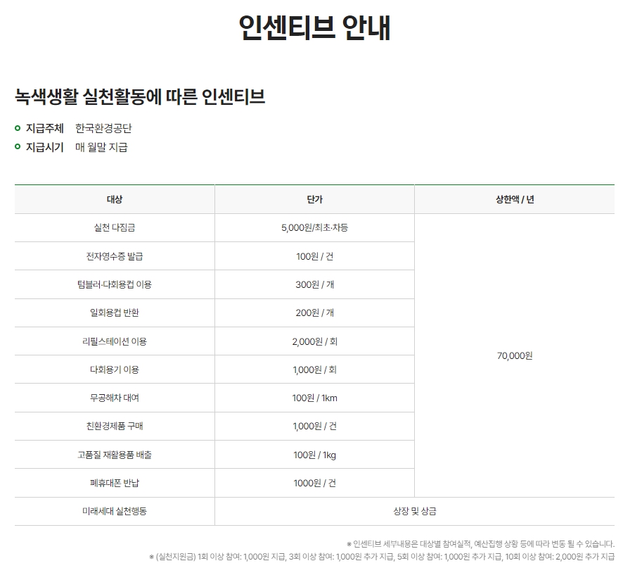 전자영수증 발급은 100원, 텀블러 이용은 300원, 친환경제품 구매는 1,000원 등 포인트는 실천활동에 따라 단가가 다르게 책정되어 있고, 연간 상한액은 70,000원입니다.