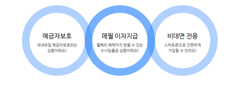 - 예금자보호 : 5천만원까지 예금자 보호가 되기 때문에 안전하게 자산을 운용할 수 있습니다.