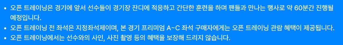 오픈 트레이닝은 경기에 앞서 선수들이 경기장 잔디에 적응하고 간단한 훈련을 하며 팬들과 만나는 행사로 약 60분간 진행될 예정입니다. 전 좌석은 지정좌석제로 본 경기 프리미엄 A~C 좌석 구매자에게는 오픈 트레이닝 관람 혜택이 제공됩니다.