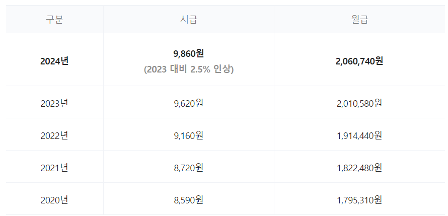 2020년부터 2024년까지 연도별 최저임금 현황과 이를 기준으로 월 수령액을 환산한 결과는 다음과 같습니다.