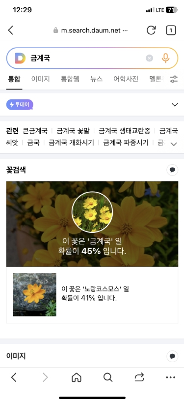 1. 다음앱을 실행하면 검색란 오른쪽 꽃그림을 클릭한 후,  '꽃검색'을 선택합니다.